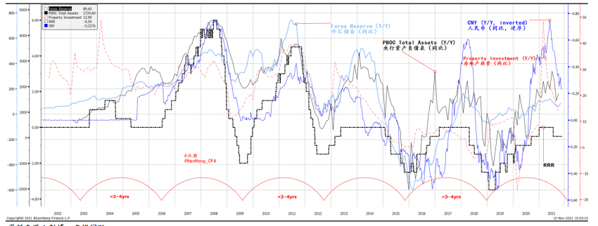 图表7:中国的外汇储备,央行资产,存款准备金率,人民币和房地产投资周期