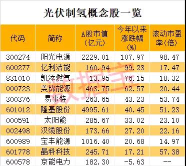 截至11月15日收盘,今年以来光伏制氢概念股平均涨幅达到47.46%,高出沪指45个百分点以上。阳光电源、亿利洁能、凯添燃气、美锦能源等4股涨幅超60%。阳光电源涨幅翻倍位居榜首,公司10月9日在互动平台表示,今年3月推出国内首款最大功率250KW的SEP50 PEM制氢电解槽,目前已签订光伏制氢示范项目。