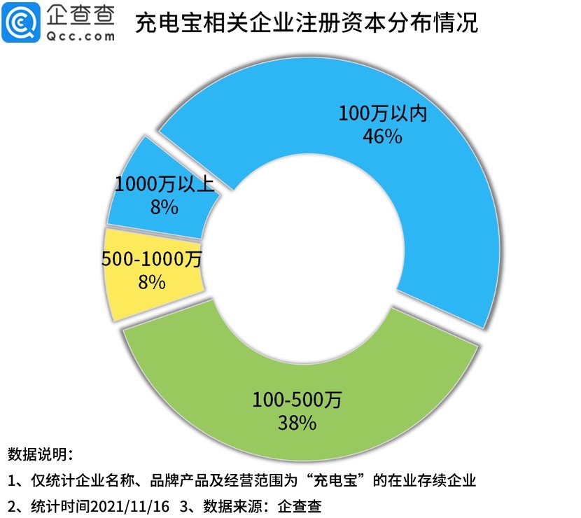 从注册资本来看,充电宝企业规模普遍偏小,注册资本在100万元以内的企业数量占46%,注册资本在100-500万元占38%;注册资本在1000万以上的则占总量的8%。