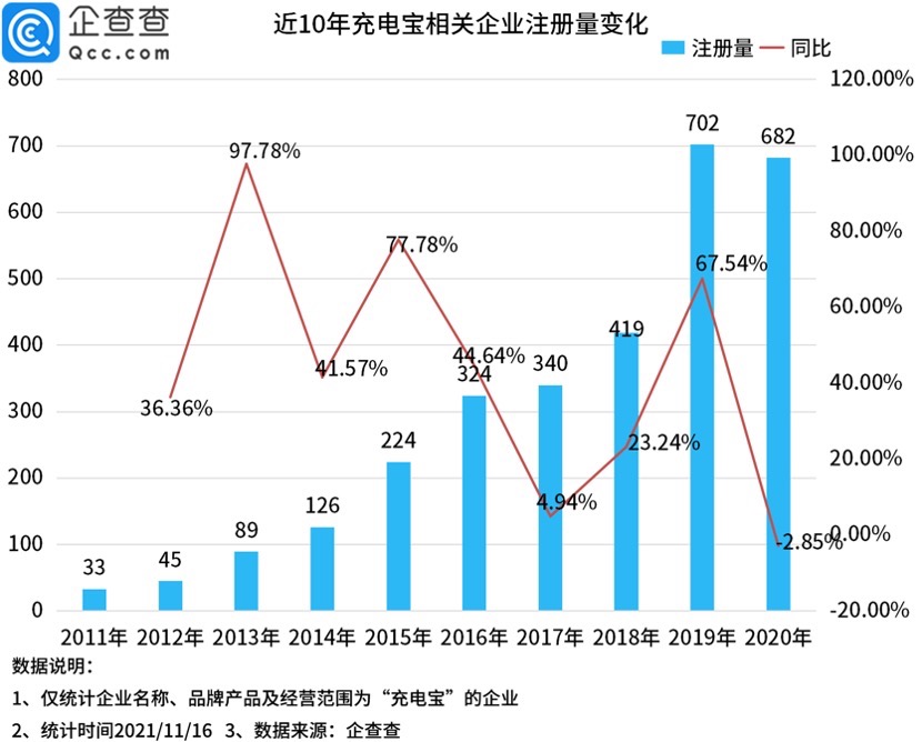 2011-2019年间,我国的充电宝相关企业注册量呈逐年递增趋势,2019年相关企业的注册量达到了十年之最,共702家,同比增长67.54%。2020年充电宝企业注册量有所下降,共新增682家,同比减少2.85%。2021年的前10月共新增充电宝企业367家,同比减少32%。