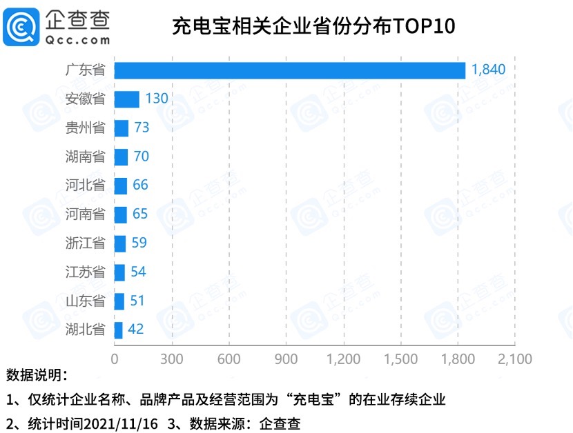 企查查数据显示,我国现存“充电宝”相关企业近2900家,其中2019年新增702家;2020年新增682家,同比下降2.85%;2021年前10月共新增367家,同比减少32%。从地域分布来看,广东省以1840家位居首位,占全国总量的64%;安徽、贵州、湖南、河北分列2-5位。