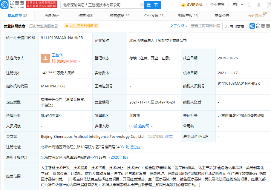 企查查信息显示,深纳普思致力于研发、制造人工智能赋能(AI供电)医疗级智能可穿戴设备,公司成立于2019年,法定代表人为王智华,经营范围包含:仪器仪表、计算机、软件及辅助设备;医学研究与试验发展等。