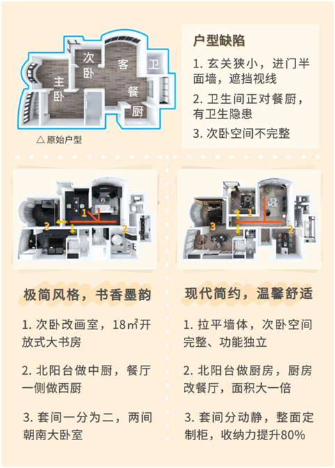 1. 拉平墙体造走廊,次卧空间完整、功能独立