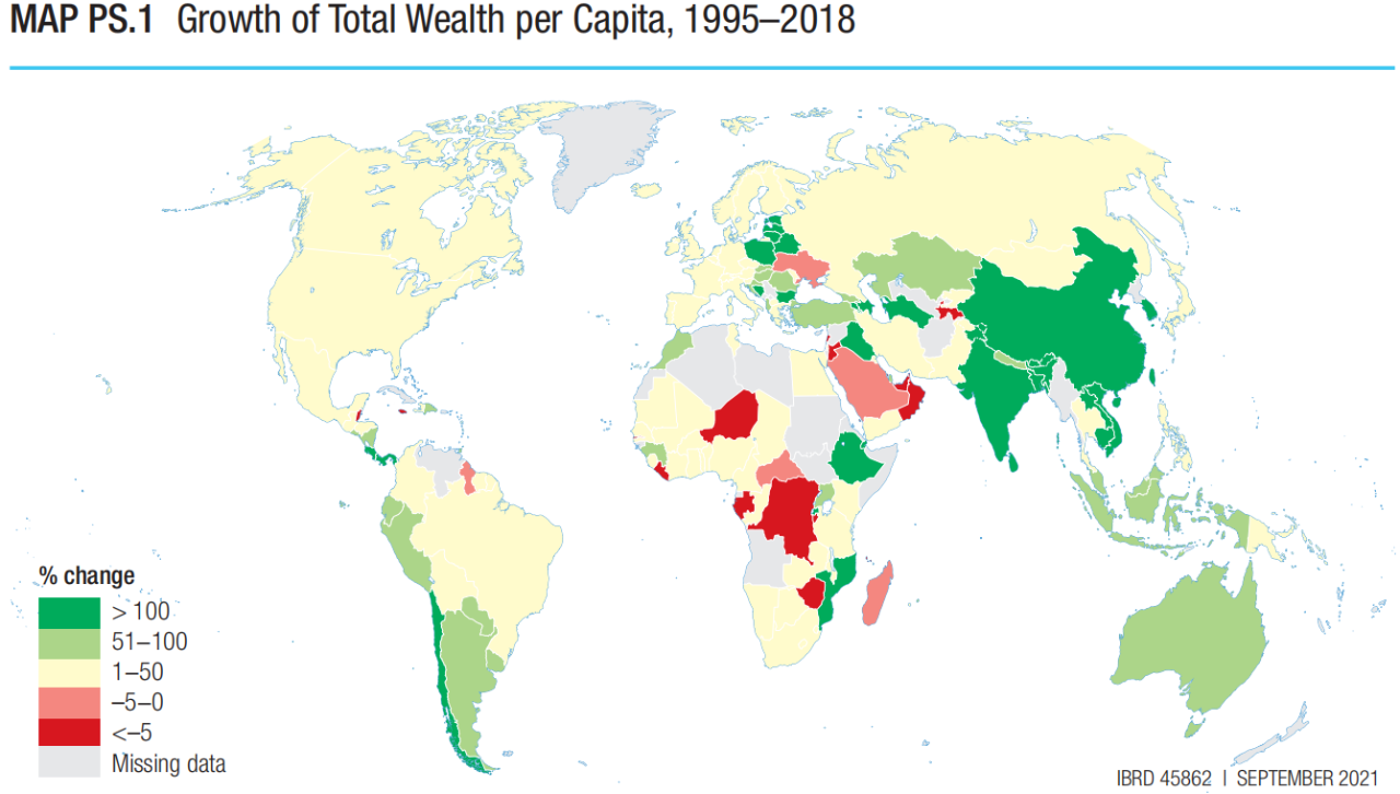 在度量和监测经济增长方面,“CWON 2021对人均财富随时间变化的衡量标准”在跟踪经济增长可持续性方面提供了可行方法。因此,它也被认为是除GDP以外另一重要的经济测度指标。尽管1995年至2018年间全球人均财富总额有所增长(图1),但许多国家正走在不可持续的发展道路上,因为它们的自然、人力或生产资本正被用于支撑收入或消费的短期增长。目前在一些国家,其国内生产总值是通过持续地消耗资产来实现的(如过度捕捞或土壤退化),而总财富水平正在下降。即使GDP上升,上述情况也可能发生(因为这一发展路径已经透支了未来的繁荣)。