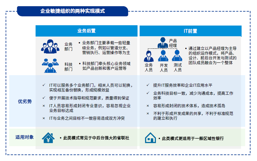 数字化转型是新技术带动业务转型,在实施数字化转型过程中,科技与业务双方需肩并肩共同战斗,既需要了解业务本身,又需要了解技术对业务的影响,才能找到数字化的业务方向。区域性银行需要建立企业级敏捷组织,提升行内数字化资源的配置效率。企业级敏捷组织主要分为两种实现模式。