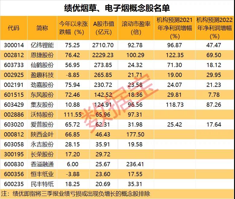 统计显示,涉及烟草和电子烟概念股共26股。从机构关注度来看,概念股中恩捷科技、亿纬锂能、劲嘉股份、仙鹤股份均有10家以上机构评级。