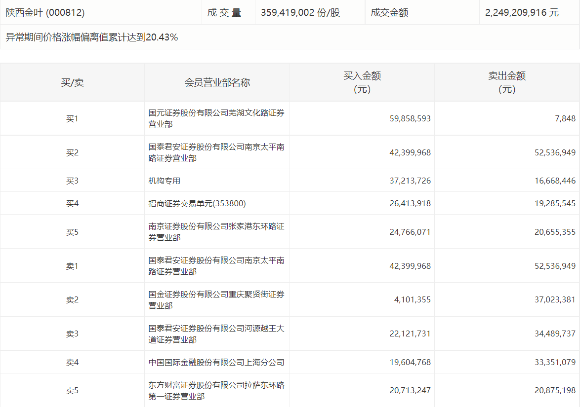 陕西金叶今日涨停,成交额15.16亿元。盘后数据显示,国元证券芜湖文化路证券营业部买入5986万元,1家机构专用席位净买入1500.07万元。