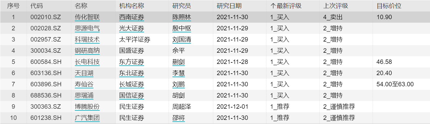 Wind数据显示,机构本周共调高了10只个股评级,其中长电科技获东方证券“买入”评级,目标价46.58元;天目湖获东北证券“买入”评级,目标价20.4元;传化智联获西南证券“买入”评级,目标价10.9元;思源电气、科瑞技术、钢研高纳、寿仙谷、思瑞浦、博腾股份、广汽集团均获机构推荐。