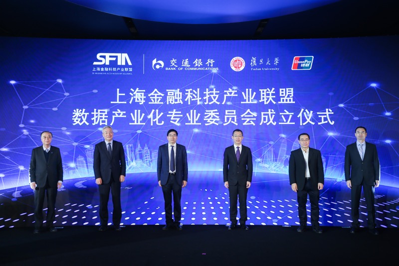 央行上海总部副主任刘兴亚,上海市地方金融监督管理局副局长葛平,上海国际集团总裁刘信义,交通银行副行长钱斌,复旦大学副校长、中国科学院院士张人禾,中国银联执行副总裁涂晓军为数据产业化专委会成立揭牌。