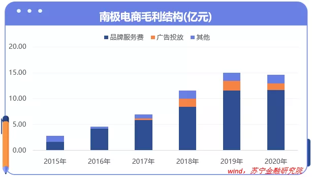 2020年,受疫情催化,线上零售继续保持高增长,全国线上零售额同比增长11%,但南极电商的品牌服务费收入却显著放缓。从毛利收入来看,2020年品牌服务费实现毛利11.62亿元,仅同比微增0.26%。