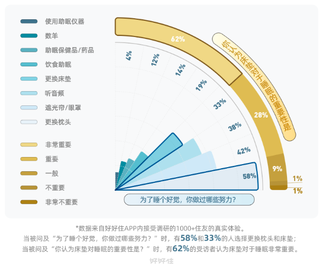 在本次调研中,也有朋友表示为了睡个好觉会选择更换枕头和床垫,超过一半的受访者认为床垫对于睡眠非常重要,可见大家已经意识并体验到适合的寝具更能促进高质量睡眠。