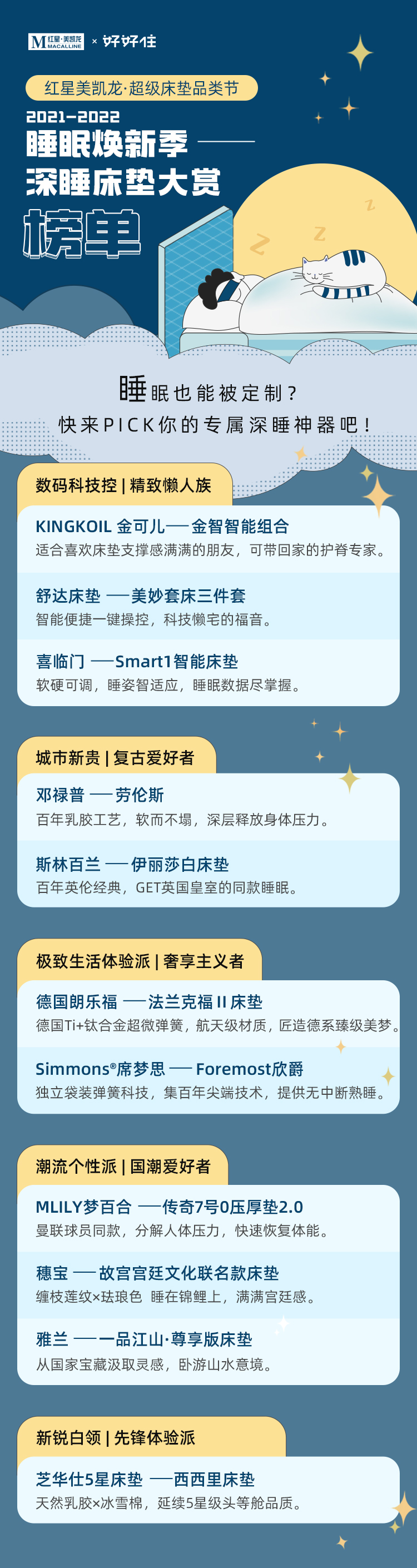 为了大家都能通过选到合适的床垫,轻松get「婴儿级」深度好觉,我们专门根据不同床垫功能特质整理了一份甄选推荐榜单。不管你是数码控、复古派,还是国潮党、乐享族,都能找准自己合适又心水的那一款床垫!