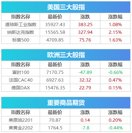 美东时间周三,美股探底回升全线收高,截至收盘,道指涨383.25点,涨幅1.08%,报35927.43点;纳指涨2.15%,报15565.58点;标普500指数涨1.63%,报4709.85点。