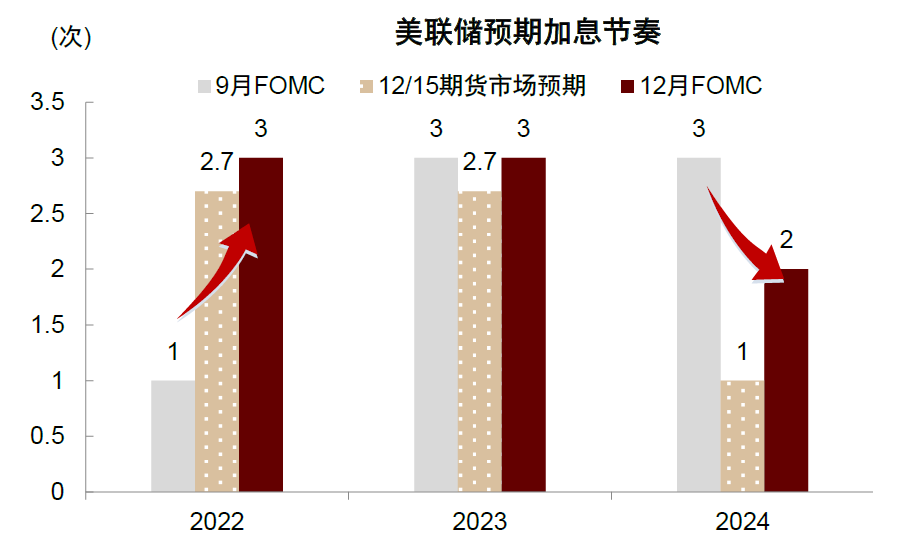 图表:虽然12月散点图上调2022年加息预期,但同时下调2024年加息预期,本次加息周期可能节奏“前快后慢”,提前结束