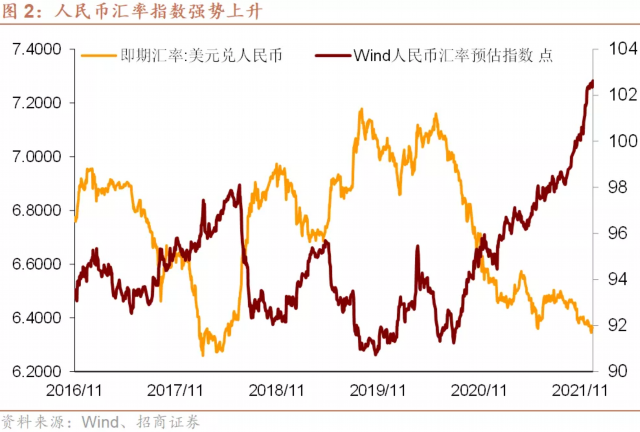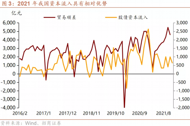 人民币汇率逆势走强,可能反映出在美元指数所反映的全球流动性边际偏紧的总量背景下,我国在资本流动方面受到结构性的青睐。在疫情持续反复的情况下,其他国家经济恢复持续受到抑制,我国持续具备工业生产和金融市场稳定性方面的优势,出口和贸易顺差较高、股债市场的资本流入维持相对平稳,这一情况在当前乃至2022年或仍将延续。