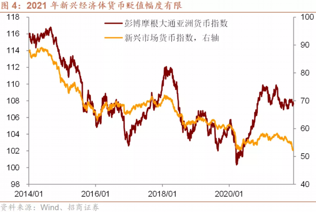 回顾上一轮收紧,美联储政策显现出很强的“买预期、卖事实”效应,流动性收紧的影响主要体现在预期阶段,加息预期上升的影响或未充分体现。短期美联储货币政策收紧预期加强可能对新兴国家/地区股票市场和商品价格造成冲击,美联储政策收紧的措施会引发新兴市场国家/地区的恐慌情绪和资本外流。但是,鉴于本轮美联储政策收紧周期中,全球处于商品价格上行和通胀环境,新兴经济体、商品国等的经济基本面均相对强劲,甚至有较多新兴经济体已经率先进入加息周期,预计此轮收紧所造成的冲击明显小于2013年、2015年。2021年以来,虽然新兴经济体货币有所贬值,但相较2014-2015年的情况而言,已经较为平稳。
