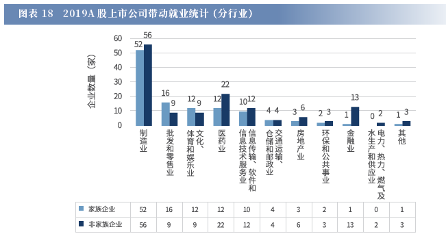 分行业来看, 在CSR 报告中披露带动就业的非家族企业多来自于制造业,其次是医药业和金融业,分别为56 家,22 家和13 家。该指标下家族企业则多来自于制造业,批发和零售业与医药业,分别为52 家,16 家和12 家(图表18)。