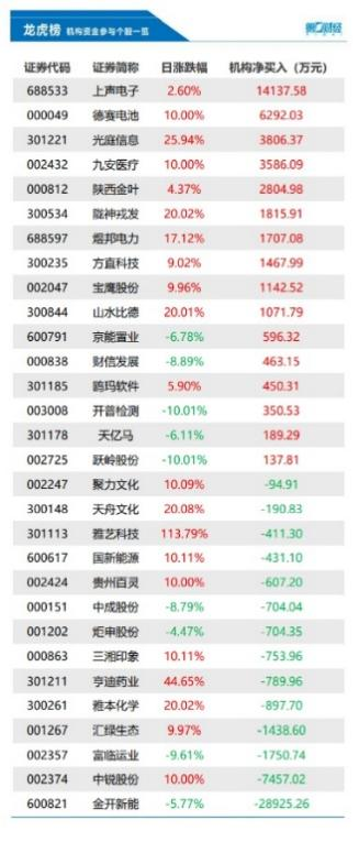 12月22日盘后数据显示,共30只个股出现了机构的身影,有16只股票呈现机构净买入,14只个股呈现机构净卖出。当天机构净买入前三的股票分别是上声电子、德赛电池、光庭信息,净卖出前三的股票分别是金开新能、中锐股份、富临运业。