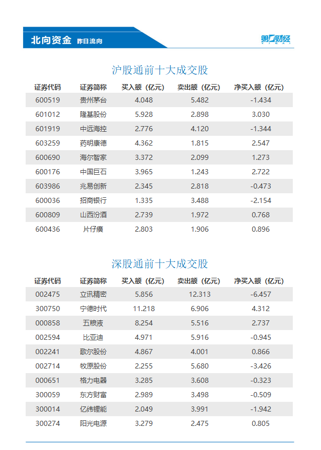 12月22日,北向资金净卖出17.45亿元,其中沪股通净卖出17.06亿元,深股通净卖出0.39亿元。前十大成交股中,宁德时代、隆基股份、五粮液买入额位列前三,立讯精密、牧原股份、招商银行净卖出额位列前三。