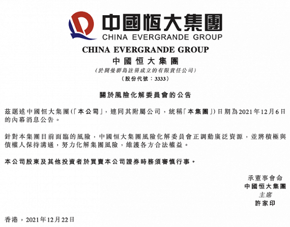 中国恒大12月22日晚间在港交所公告,针对本集团目前面临的风险,中国恒大集团风险化解委员会正调动广泛资源,并将积极与债权人保持沟通,努力化解集团风险,维护各方合法权益。