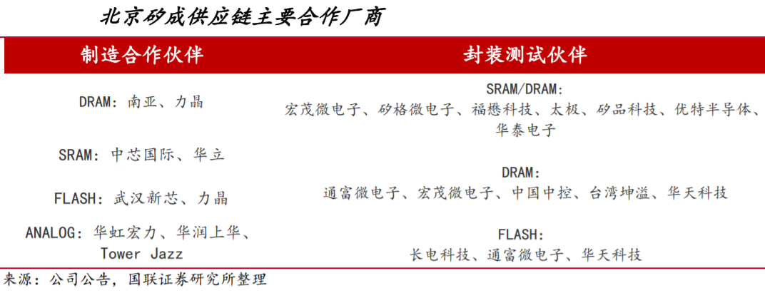具体来看,北京矽成定位专业级存储芯片fabless厂商,产品线覆盖各类主流存储芯片,包括各类型高性能DRAM、SRAM、FLASH存储芯片和ANALOG模拟芯片,产品主要应用于汽车电子、工业制造、通讯设备等行业领域。合作供应商包括力晶、中芯国际、华虹、TowerJazz等全球领先晶圆代工和封测厂商,产品技术可靠性及产能保障程度高。