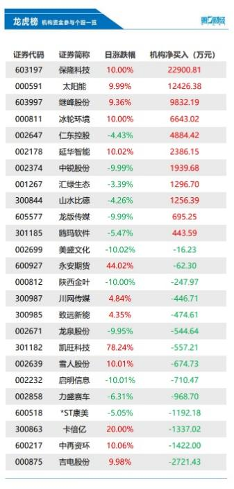 12月23日盘后数据显示,共25只个股出现了机构的身影,有11只股票呈现机构净买入,14只个股呈现机构净卖出。当天机构净买入前三的股票分别是保隆科技、太阳能、继峰股份,净卖出前三的股票分别是吉电股份、中再资环、卡倍亿。