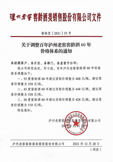 泸州老窖上调百年泸州老窖窖龄酒60年价格