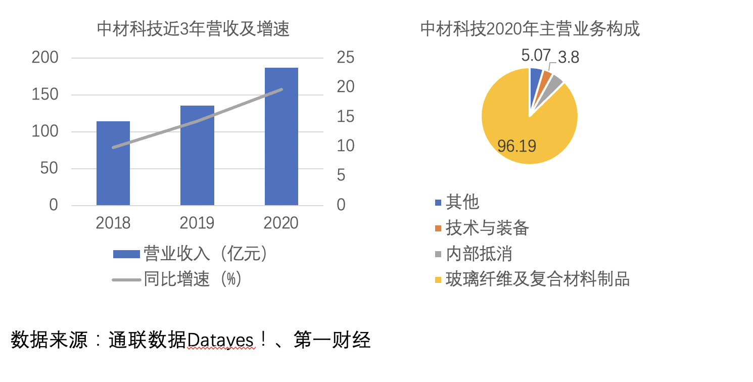 风电叶片、玻璃纤维及制品是公司两大主导产业。2020年两大业务营收分别为89.77亿、67.01亿元,分别占总营收的47.98%、35.81%。