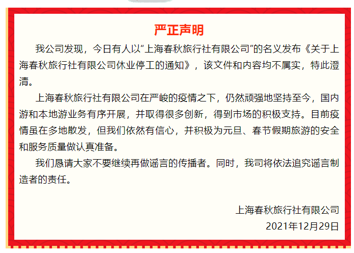 春秋旅游12月29日发布声明,公司发现,有人以“上海春秋旅行社有限公司”的名义发布《关于上海春秋旅行社有限公司休业停工的通知》,该文件和内容均不属实,特此澄清。