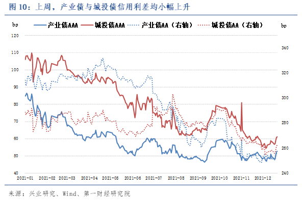 根据兴业研究的数据,截至12月24日,AAA级产业债信用利差为52.79bp,AA级产业债信用利差为256.39bp;AAA级城投债信用利差为61.13bp,AA级城投债信用利差为262.3bp。
