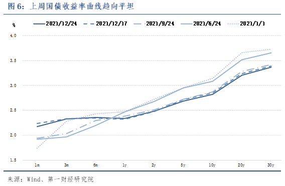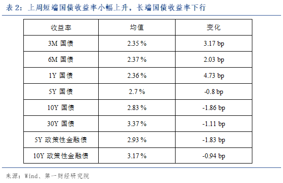 上周,短端国债收益率小幅上升,长端国债收益率下行,国债收益率曲线整体更为平坦。