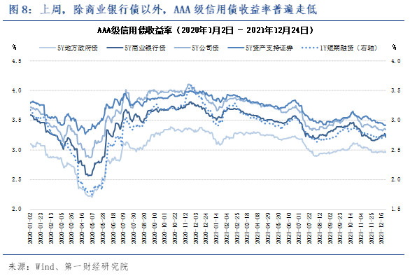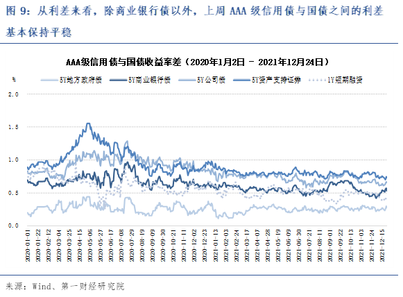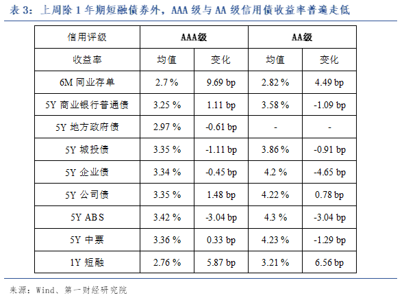 从信用债市场来看,上周除商业银行债以外,AAA级信用债收益率普遍走低,AAA级信用债与国债之间的利差基本保持平稳。