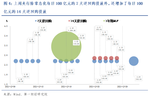 上周央行每日投放7天逆回购100亿元,7天逆回购利率维持在2.2%。受年末因素影响,央行每日增加投放14天逆回购100亿元,利率维持在2.35%。