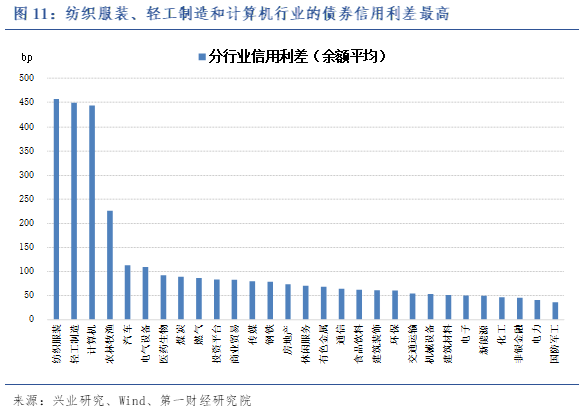 从分行业来看,计算机、轻工制造和纺织服装行业的债券信用利差最高,分别为456.81bp、448.99bp和443.58bp。