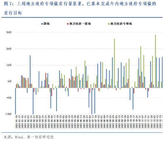 上周,国债与地方政府专项债发行均有所提速。其中,上周国债净融资额为1909.2亿元,地方政府专项债净融资额高达3540.71亿元。截至12月26日,年内地方政府专项债券净融资额已达成全年3.65万亿元的目标。12月16日,财政部副部长许宏才在国新办举行的国务院政策例行吹风会上表示,近期财政部已向各地提前下达了2022年新增专项债务限额1.46万亿元,需在明年一季度发行完毕。