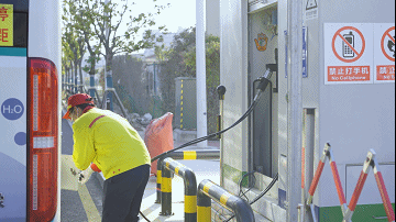 现在小周来到的就是临港的首座临时加氢站,位于鸿音路公交首末站。“十四五”期间,新片区还将建成14座加氢站。就在最近,临港首个集加氢、加油、充电于一体的综合交通能源站——“平霄路油氢合建站”,也已经投入使用。你看,加氢站的员工正在给公交车充装氢气,公交车发动后,氢气在电堆内与氧气会发生电化学反应,直接转换成电能。