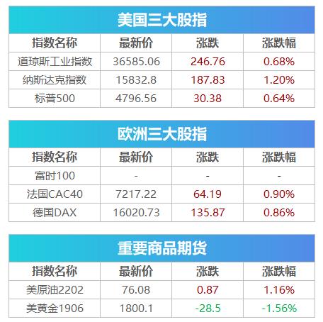 美股2022年首个交易日,道指涨246.76点,涨幅0.68%,报36585.06点,纳指涨1.20%,报15832.80点,标普500指数涨0.64%,报4796.56点。