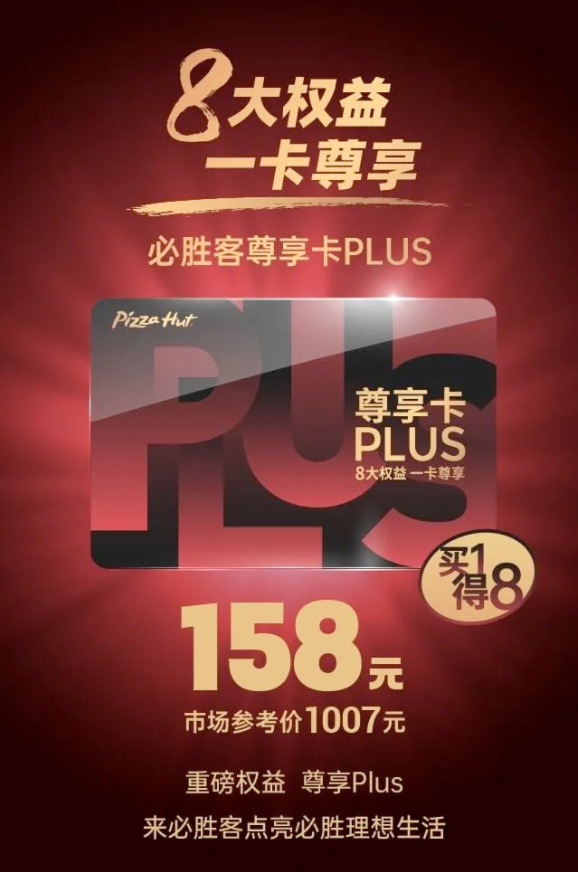 必胜客也的确为自己的会员带来了更多增值的服务与体验:如在节日营销方面,每年的8月被设定为必胜客的会员月,必胜客会针对会员推出力度非常大的活动,吸引会员前来。另外还会与芒果TV、爱奇艺等视频网站合作,可以吸引热爱娱乐综艺的年轻粉丝。2021年10月,必胜客推出了“买1得8”的尊享卡,在必胜客PLUS年卡的基础上,还能享受腾讯视频、酷狗音乐、叮咚买菜等多个不同类型平台的会员服务。