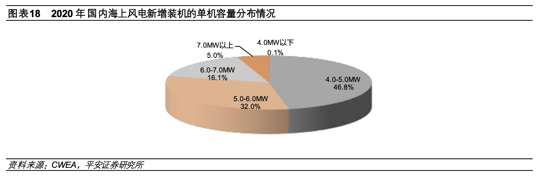 站在当前时点,国内风机企业已经储备好海上大型风机技术。2020年,国内新增海上风电装机3.84GW,平均单机容量约4.9MW。2021年抢装之后中央财政补贴退出是行业内早已形成的共识,风机企业近年的新机型开发主要面向平价市场。目前看,风机企业新推的海上风电机组单机容量明显大于近年投运项目的单机容量,新推机组最大单机容量达到16MW,意味着抢装结束之后国内海上风电单机容量将快速提升。