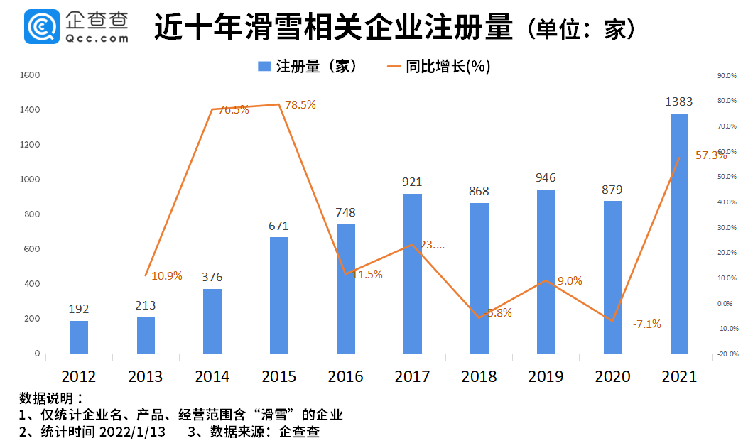 企查查数据显示,截止2022.1.13,我国滑雪相关的企业现存6800余家,2021年注册量达1383家,同比增长了57.3%,是近十年注册量最多的一年,而此前几年注册量并无明显增长趋势。从地区分布来看,河北省以752家企业高居第一,黑龙江、广东紧随其后,分别有企业679家、638家。滑雪相关企业大多分布在北方地区,东北三省的企业量均排名前五,山东、北京、新疆、内蒙古、陕西的企业量均排在前十之列。