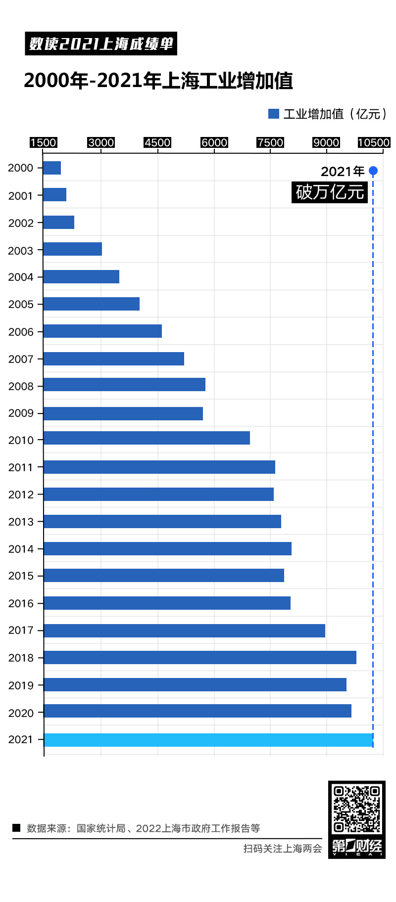 上海2021经济建设成绩单中,有这么一个数字:2021年工业增加值突破1万亿元。