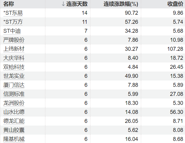 114只个股连续上涨5个交易日及以上
