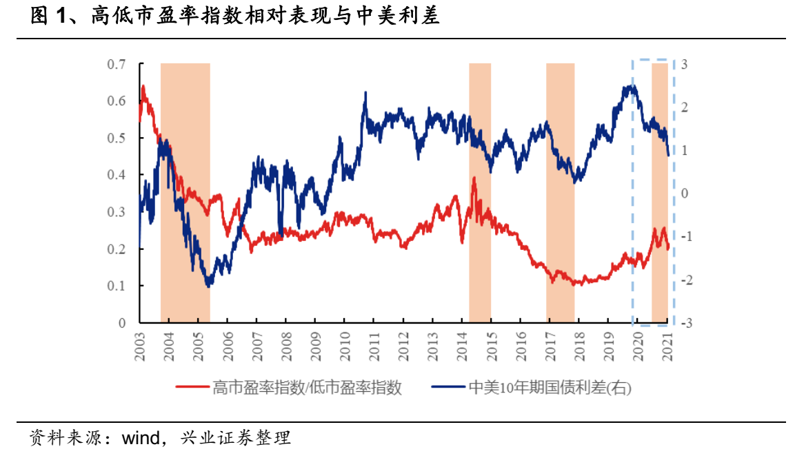 中美利差收窄,高市盈率指数通常跑输低市盈率指数。图1中阴影区域为中美货币政策方向相反且中美利差收窄的阶段,对应区间内高市盈率指数表现通常不及低市盈率指数。如果仅考虑中美利差收窄,则除2013年5月至7月外,在中美利差阶段性收窄的时间内,高市盈率指数也通常跑输低市盈率指数。2021年12月以来,A股出现明显估值切换,可能也与中美利差加速收窄有关。