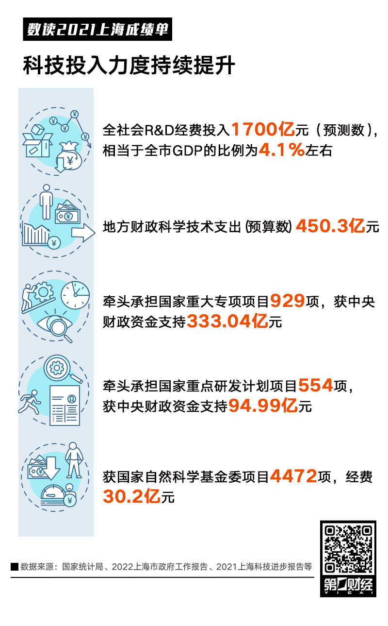 2022上海市政府工作报告指出,2021年,上海全社会研发经费支出相当于全市生产总值的比例保持在4.1%左右。在沪国家实验室建设顺利推进,世界顶尖科学家社区开工建设,张江科学城完成扩区;神舟十二号、天和核心舱、天问一号等重大任务保障有力;每万人口高价值发明专利拥有量达到34件左右。