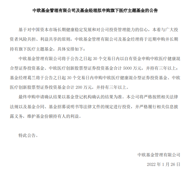 1月26日,中欧基金公告,公司将于公告之日起30个交易日内以自有资金申购中欧医疗健康基金、中欧医疗创新基金合计5000万元,并持有三年以上。与此同时,基金经理葛兰将于公告之日起30个交易日内以自有资金自购中欧医疗健康基金、中欧医疗创新基金合计200万元,并持有三年以上。