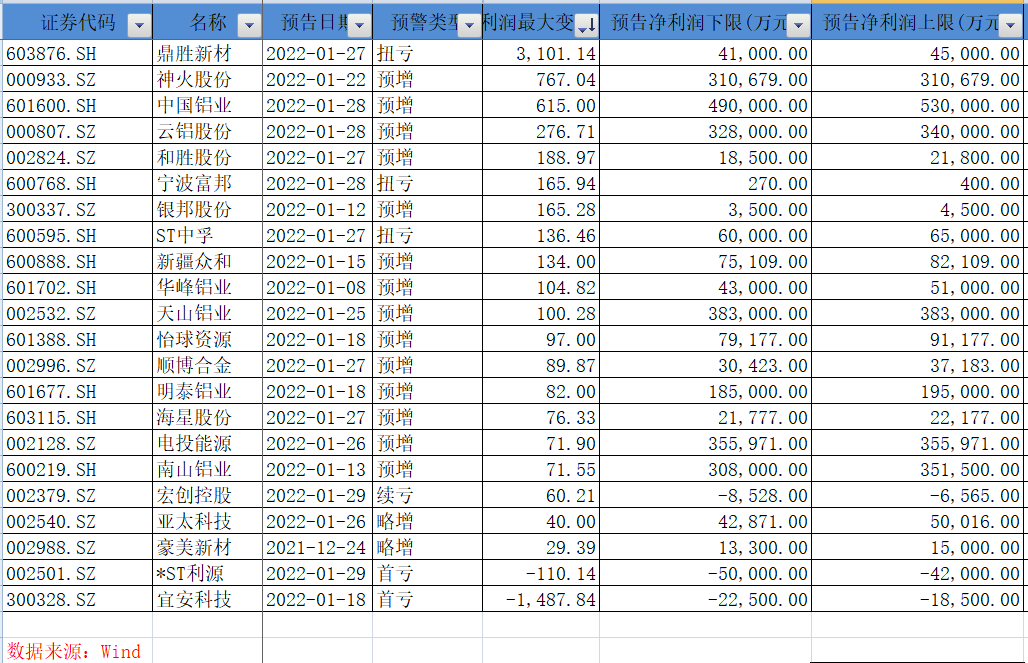 中国铝业净利额最大,报告期内实现归母净利约490000万元~530000万元,同比增长561%~615%