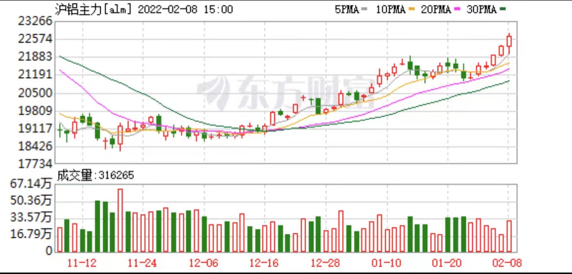 沪铝在春节后持续保持强势,电解铝期货、现货双双大涨,现货突破22000元/吨。
