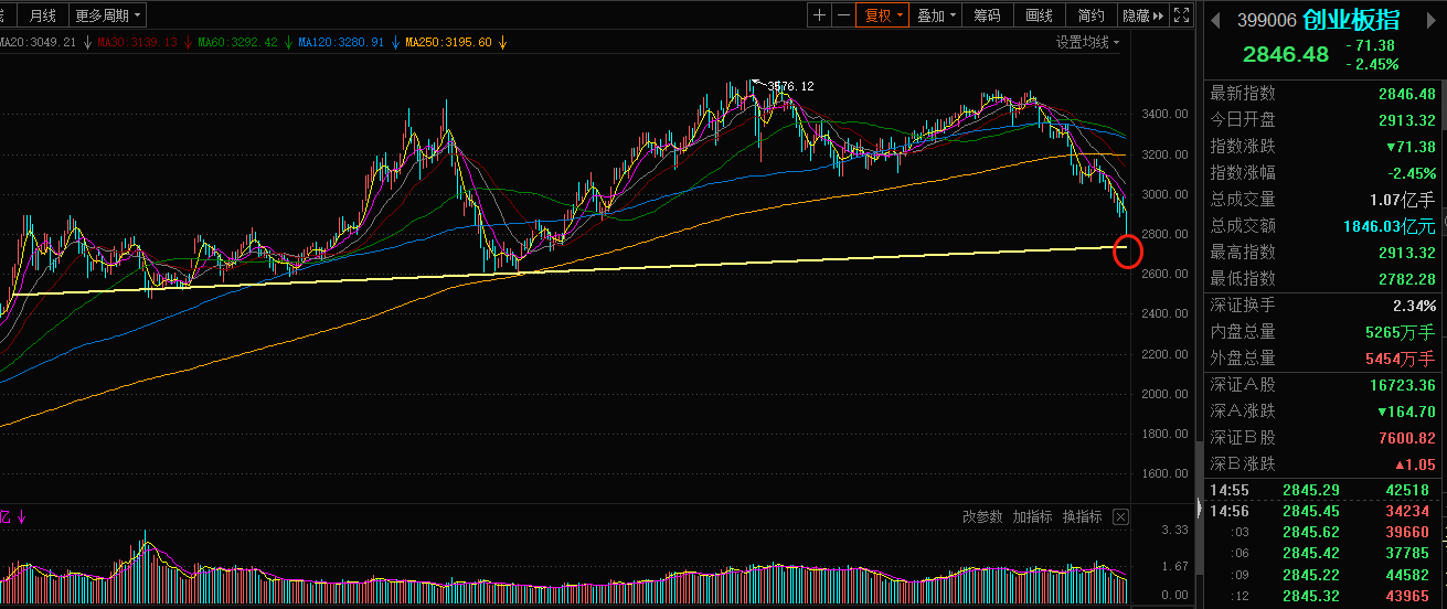 单独看创业板指数,距离2020年7月以来构筑的较大级别的支撑位还有一点距离,指数有可能反抽过后还会回踩这个平台,届时要看这个位置的支撑力度。