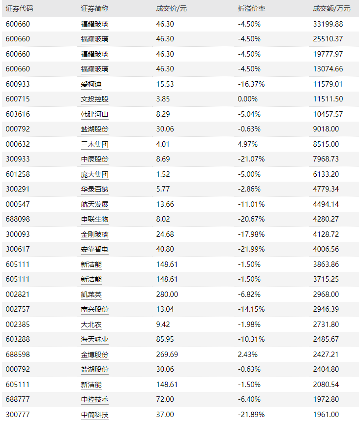 从成交金额来看,排名前三的股票分别为福耀玻璃、韩建河山、爱柯迪,成交额分别为9.16亿元、1.24亿元、1.16亿元。