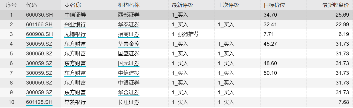 Wind数据显示,本周机构推荐5只大金融个股,中信证券、兴业银行、无锡银行、东方财富、常熟银行均获机构买入评级。